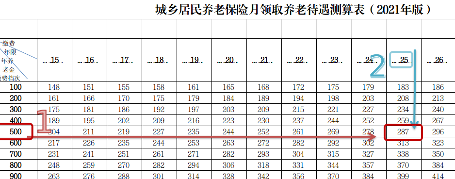 B:比如,我想500元的档次缴25年,可如图查看(两步就能找到287元)。