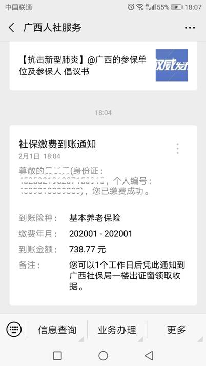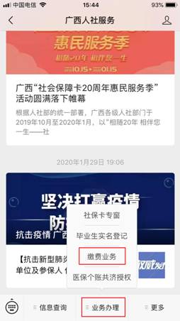 我局依托微信平台,在微信公众号“广西人社服务”中实现了玉林市本级灵活人员微信在线缴纳城镇职工基本养老保险和城镇职工基本医疗保险费功能,具体流程方法如下: