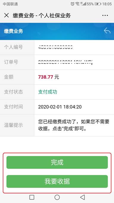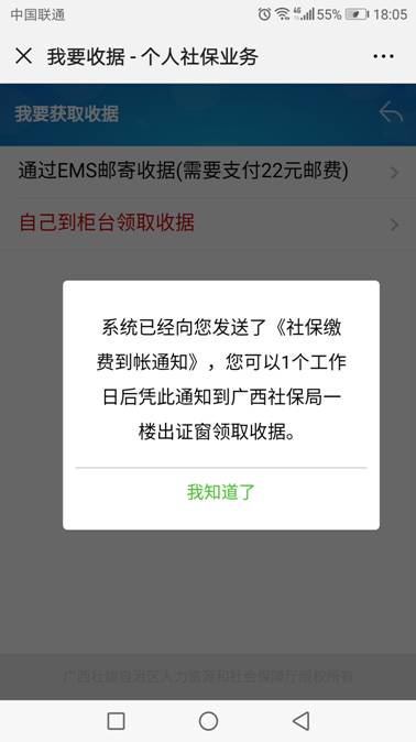第四步:领取发票。参保人查询到缴费到账后,凭微信的通知信息到柜台去领发票。
