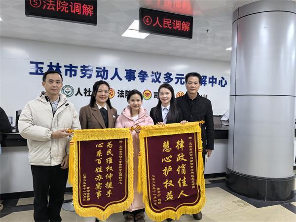 2025年11月27日上午,玉林市劳动人事争议调处中心的办事大厅里暖意融融。刚走出大学校门的黄某手持两面鲜红锦旗,郑重地送到中心工作人员和赵律师手中,锦旗上“为民维权伸援手,心系百姓办实事”“律政俏佳人、慧心护权益”的金色绣字,在阳光下格外醒目。这温情一幕的背后,是一场为新就业形态劳动者维权的暖心行动,通过人社部门与律师的协同发力,为黄某成功追回了直播带货生涯的“第一桶金”1950元。