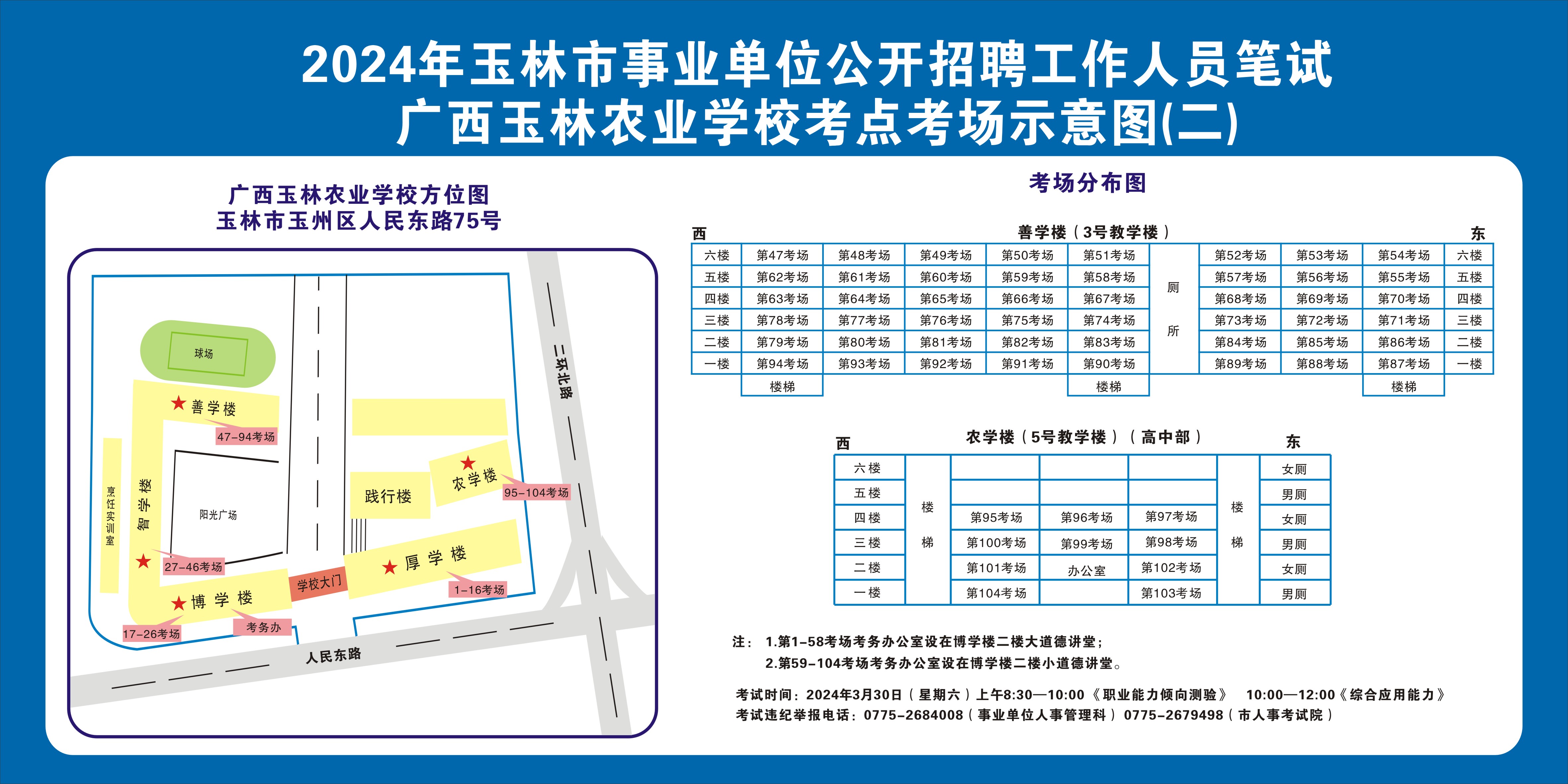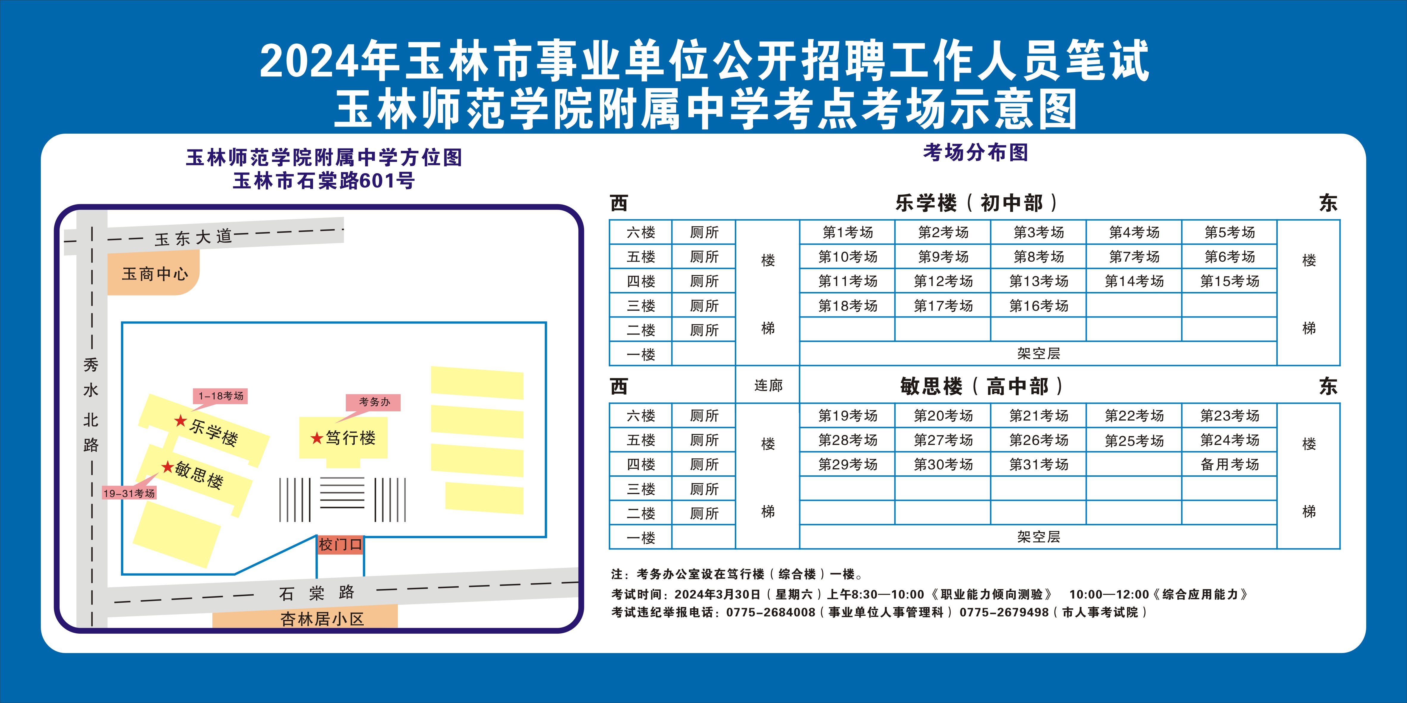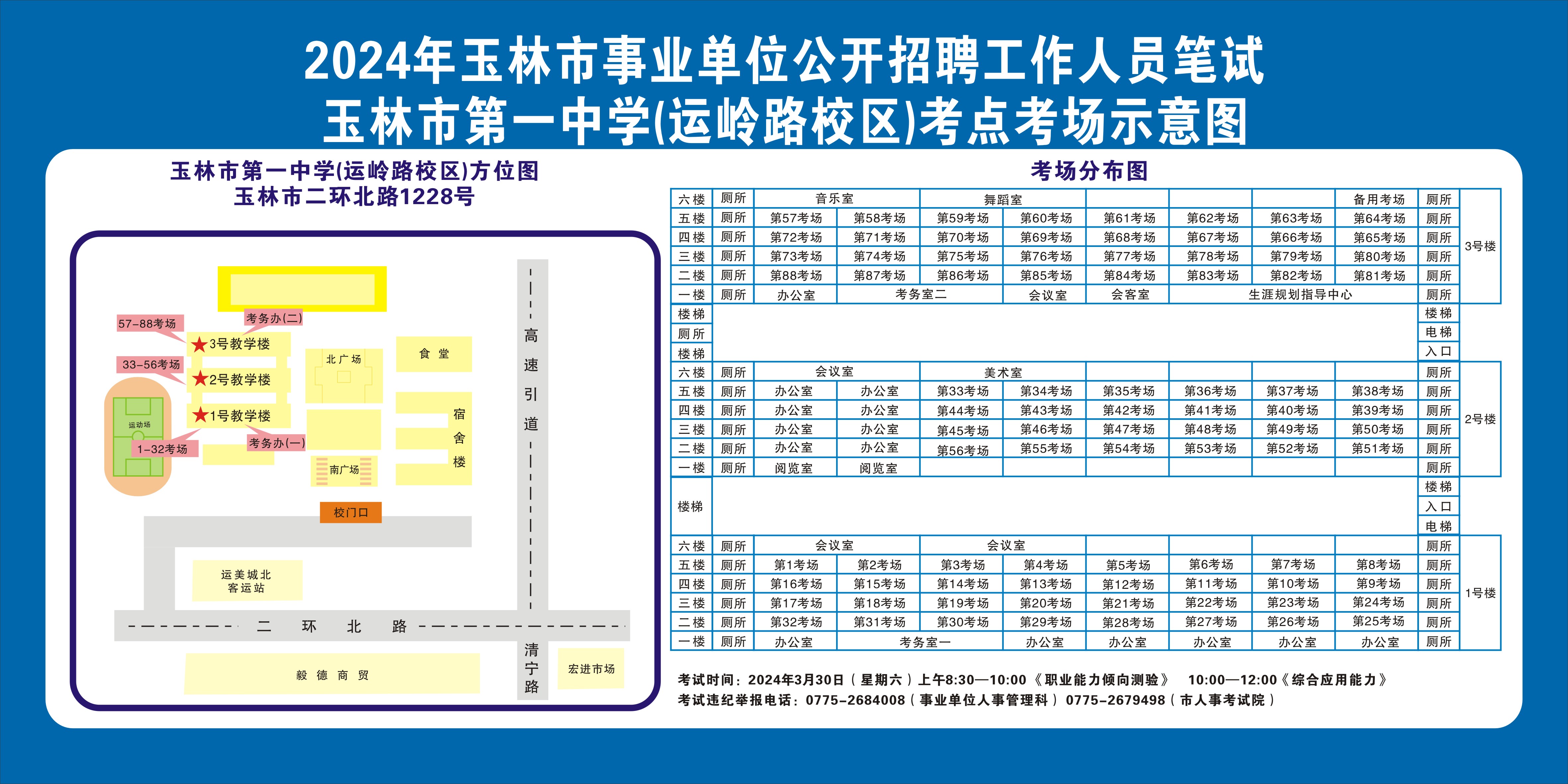 需要特别注意的是:玉林市第一职业中等专业学校考点是设在该校的东校区(人民东路东235号);玉林市第一中学考点是设在该校的运岭路校区(二环北路1228号)!