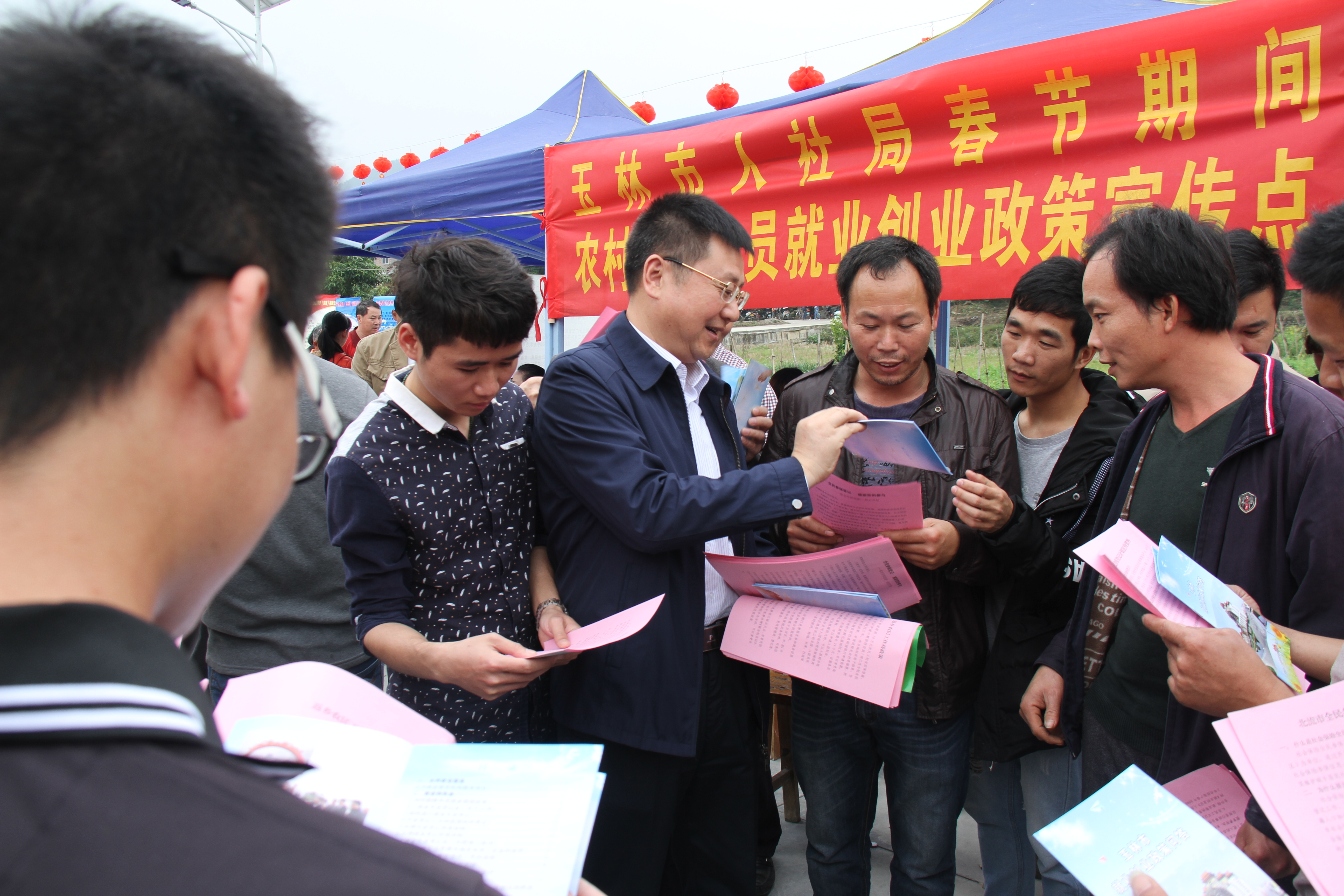 玉林市人社局程华安局长在北流塘岸镇蟠龙村华楼埌片区招聘会分会场进行政策宣传