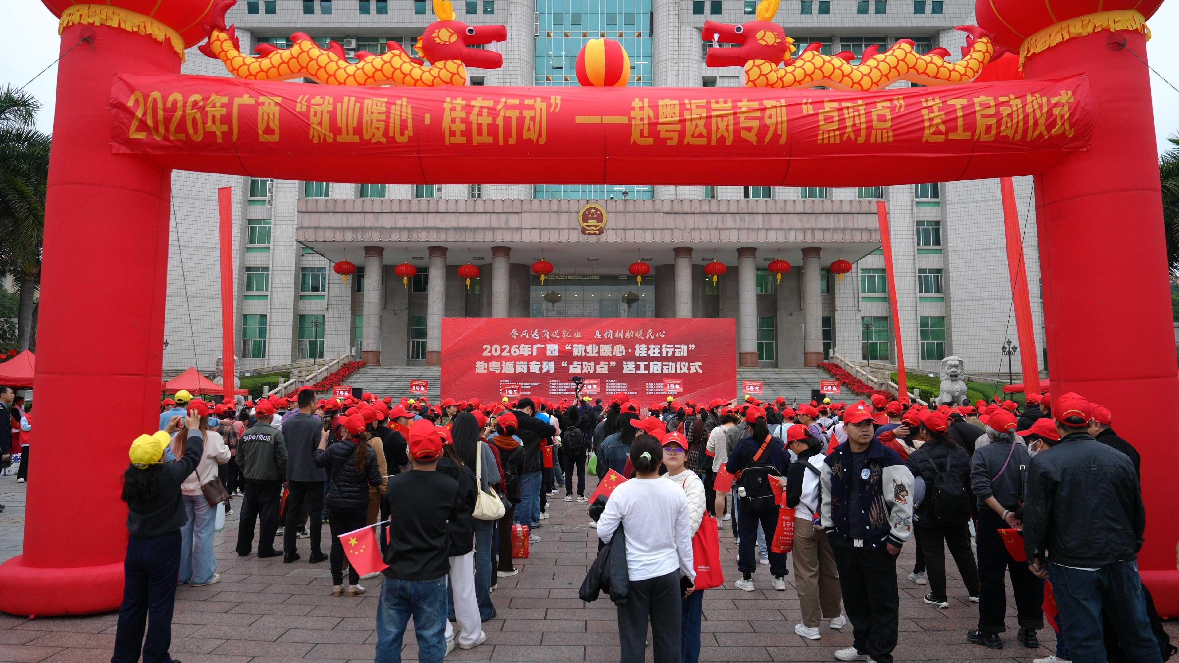 2026年2月24日(农历正月初八),兴业县人民广场上暖意融融、春意盎然。由广西壮族自治区人力资源和社会保障厅、广东省人力资源和社会保障厅、玉林市人民政府、中国铁路南宁局集团有限公司联合主办的2026年广西“就业暖心·桂在行动”——赴粤返岗专列“点对点”送工启动仪式在此隆重举行。300多名玉林籍务工人员即将乘坐赴粤返岗专列,从兴业县出发赴贵港站发车驶向广州南站,这标志着我市新年劳务协作与稳岗就业工作取得“开门红”。广西壮族自治区人力资源和社会保障厅党组成员、副厅长韦杰出席并宣布活动启动,玉林市人民政府副市长、党组成员仵建民出席活动并致辞,自治区、玉林市有关部门以及赴粤务工人员们参加了启动仪式。